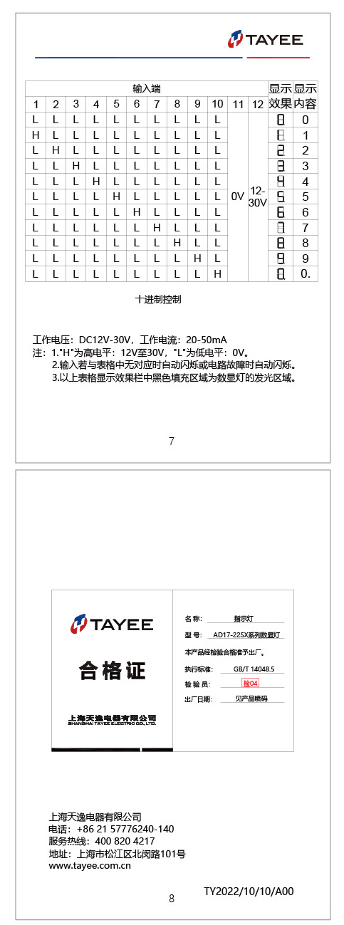 上海天逸電器股份有限公司AD17-22SX數(shù)顯燈說明書